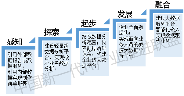 感知阶段,通过引入一些外部咨询、数据服务让整个组织感知大数据对业务发展的作用,通过培训提升组织对大数据的认识。然后在内部实现一些简单的报表实际应用到业务中去。