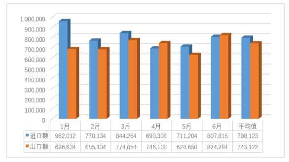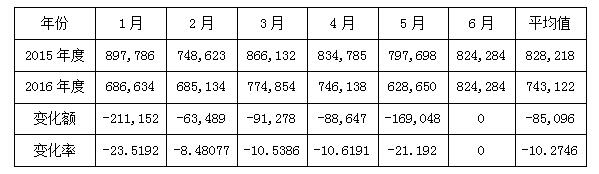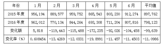 2016年1-6月,日本的电子信息产品进口额除6月份外均高于出口额,维持在平均每月0.798万亿日元,1月份为峰值,然后逐渐下降。该变化趋势受工业电子设备影响较大,电子元器件与民用电子设备的进口额变化比较平稳(参见图2)。相较去年同期,除1月份略有增长以外,其余月份均呈现比较明显的下降趋势,平均降幅达到11.09%(参见表1)。