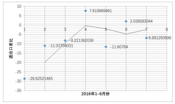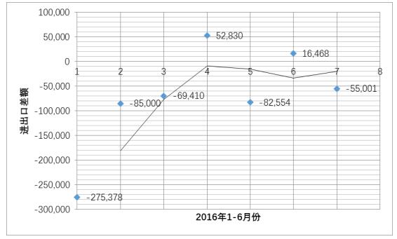 图5 2016年1-6月日本电子产品进出口差额及差比(单位:百万日元)