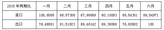 2016年1月贸易逆差比较明显,进出口差比达到28.62%,随后进出口差距减小,4月与6月还分别实现了贸易顺差,单从电子信息产品进出口来看,贸易状况总体呈现渐好的趋势(参见图4、图5)。但是对比去年同期进出口总额发现,截至6月,除1月进口与6月出口额同去年基本持平外,其余各月进出口总额均有明显下降,最高降幅达到23.52%,同去年总体进出口额呈现增长态势相比,今年上半年贸易规模明显萎缩,说明2014年开始,通过提高工资水平刺激国内消费与进口的政策红利已过,整体电子信息产品贸易呈现下行趋势(参见表3)。