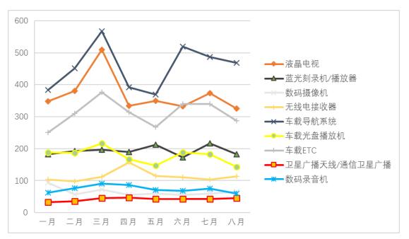 2016年1-8月车载导航系统、液晶电视的出货量相对较高,波动性大,均在3月达到峰值,分别为56.7万台和51万台,相比2015年峰值出货量分别下降近10万台。但车载导航系统1-8月的平均出货量相比去年同期增长了4.87%,而液晶电视则下降8.83%。 车载ETC、蓝光刻录机/播放器和车载光盘播放机出货量相对居中,其中车载ETC的波动较大,峰值较去年增长了近2万台,1-8月平均出货量增长率最高,达到13.63%,另外两者变化较为平缓,平均出货量均呈现下降趋势。数码摄像机、无线电接收器、卫星广播天线和数码录音机的出货量相对较低,除无线电接收器波动较大外,其余变化均相对平缓,四种产品出货量相比去年同期也呈现下降趋势,其中数码录音机降幅最大,达到21.12%(参见图6、表4)。从日本主要消费电子设备的国内出货量来看,整体状况同产值、进出口贸易趋势类似,呈现萎缩态势,车载导航系统和ETC凭借海外良好的销售状况出货量继续增长。