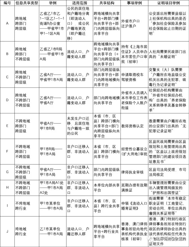 下面以上海市市民办事项目为样本,分别从适用范围、共享结构、共享难度、事项举例四方面,对10类信息共享进行说明(参见表1)。