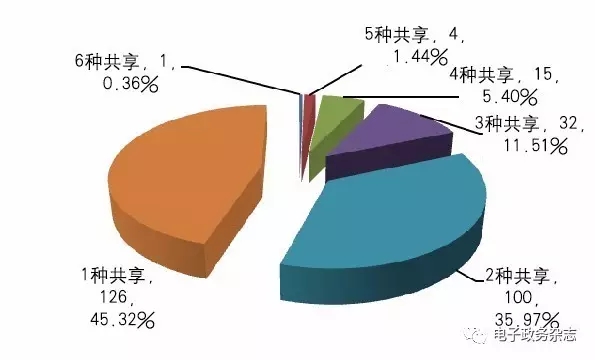 统计表明,在126个事项中,仅出现一种共享类型;在100个事项中,出现2种共享类型;在32个事项中,出现3种共享类型;在15个事项中,出现4种共享类型;在4个事项中,出现了5种共享类型;在1个事项中,出现了6种共享类型;各种情况占总数的比例如图2所示。因此,达成2种类型的共享就可以完成的办事项目达到总数的81.29%,需要3类及以上共享的仅占办事项目的18.71%。