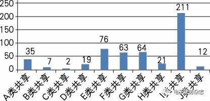 统计表明,各类共享出现的频率有显著差异,如图3所示,从出现频率最高到最低的分别是:I类共享出现在211个事项中,占总数的75.90%;E类共享出现在27.34%的办事项目中;随后依次是G类(23.02%),F类(22.26%),A类(12.59%)H类(7.55%),D类(6.83%)J类(4.32%),B类(2.52%)和C类(0.72%)。值得注意的是,出现最多的I类共享意味着公民办证过程中需要得到政府部门以外的企事业单位的证明,这是在以往的政府信息共享研究框架中未曾出现的。