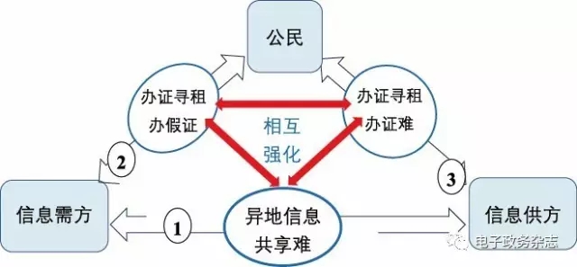 在这样的态势下,信息生态链产生了两个副产品:权力寻租和办假证。权力寻租源于信息供方和需方相对于公民的信息生态位优势,为了建立信息链,实现信息流动,公民被迫支付信息租金[4]。办假证是在信息生态链的环节③不通畅的情况下,为公民构建一个虚拟的完整信息链而滋生的违法活动。不仅如此,由于经济利益的驱使,两个副产品和信息共享难之间存在相互强化的关系,即“共享难→办证寻租→办假证→共享需求降低→共享更难……”。
