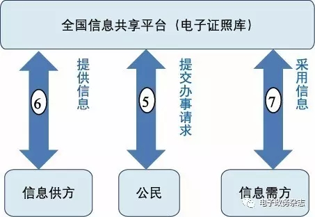 如图5所示,通过全国信息共享平台,特别是共享的电子证照库,在信息生态链中增加了信息共享平台作为参与方,将原有信息生态链重构为⑤+⑥+⑦。包括三个环节:第一,公民信息共享平台提交办事请求,即环节⑤;第二,信息供方通过平台接收请求,信息从供方传递到平台,即环节⑥;第三,信息需方从共享平台上采用信息,完成信息共享过程,即环节⑦。在这个生态链中参与四方的生态位具有以下特点:信息共享平台的生态位,在时空、功能和资源维度上完全覆盖另外三方;公民、信息供方和信息需方在信息生态位的时空、功能和资源维度上部分重叠;相对于信息共享平台,公民、信息供方、信息需方的信息生态位地位相当。