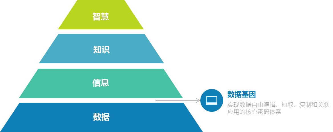在这个金字塔体系中,我们认为数据基因位于数据层和信息层,它赋予数据特定的含义,与数据一起构成了我们认知信息的基础。