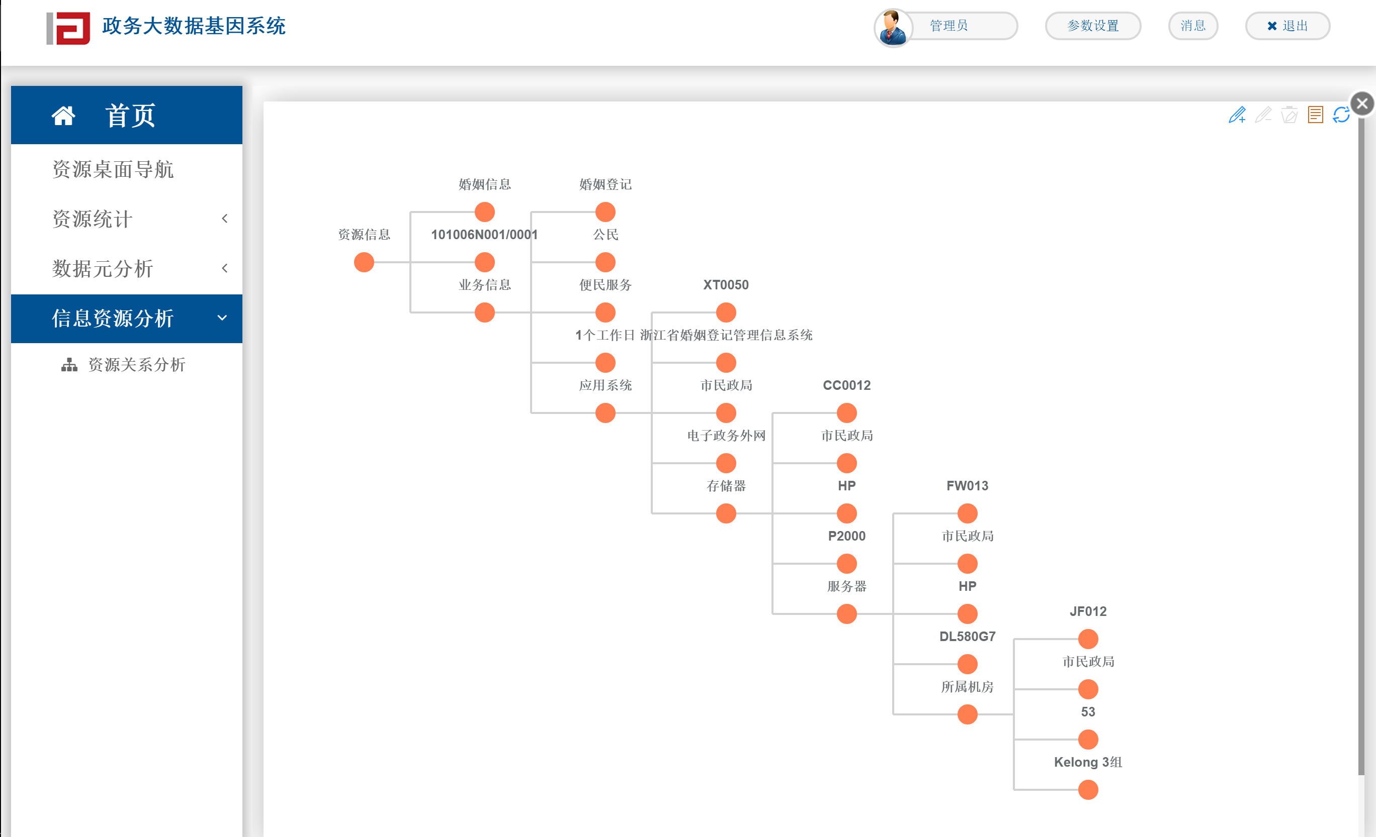 数据基因系统通过对城市机房、服务器、应用系统、数据库等数据资产的梳理,建立部门数据资产清单,通过系统建立之间的相互关系,理清楚系统与系统之间、系统与数据库、表之间、数据与数据之间的关系,实现数据-数据表-数据库-应用系统-服务器-机房(云)的关系展现,建立部门数据资产地图。