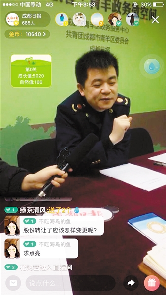 据介绍,这场由本报直播团队和青羊区共同举办的政务服务网络直播活动在我市尚属首次,在近50分钟的直播时间里,累计吸引了9000余人次在线观看,青羊区市场监管局、青羊区卫计局相关窗口首席代表在线解答网友提问6个,通过网络直播的手段,实时在线与网友互动。