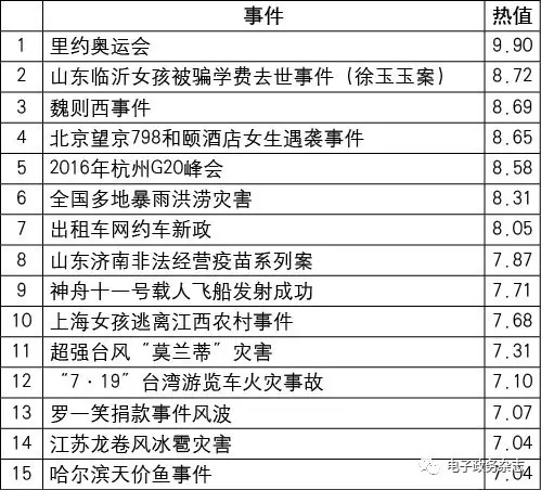 注:根据新闻网站、报刊对事件的报道数以及微博、微信、论坛博客等平台的讨论量,对600多起舆情案例分析,综合权重计算得出排名前15的事件。