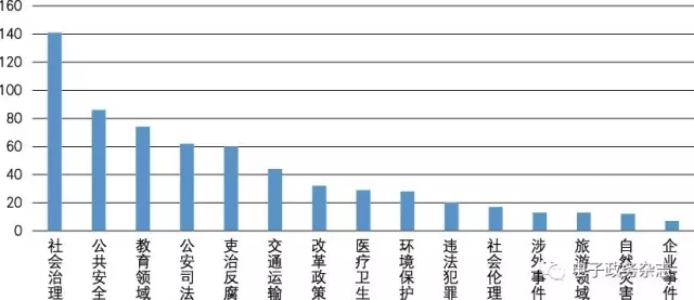 统计显示,部委办所面对的舆情事件本身也相对较多且具有公共讨论热度。如2016年8月发生的山东临沂女孩被骗学费去世事件(徐玉玉案)引发连锁反应,公安部门迅速发出A级通缉令将犯案人员缉拿归案。随后,公安部连同工信部、中国人民银行等在内的多个国家部委出台政策重点打击电信诈骗,全国多地掀起打击电信诈骗的专项行动。2016年安全生产事故频发,国家安全生产监管总局也成为舆论场的重要回应部门。中国民用航空局在上海虹桥机场两架飞机冲突事件中表现抢眼,积极地介入并及时公布处置结果,获得各界肯定。国庆假日旅游高峰期,各地旅游类舆情事件频发,国家旅游局多措并举规范国庆假日旅游市场秩序,发布“十一”旅游“红黑榜”,受到网民的欢迎(参见表3)。