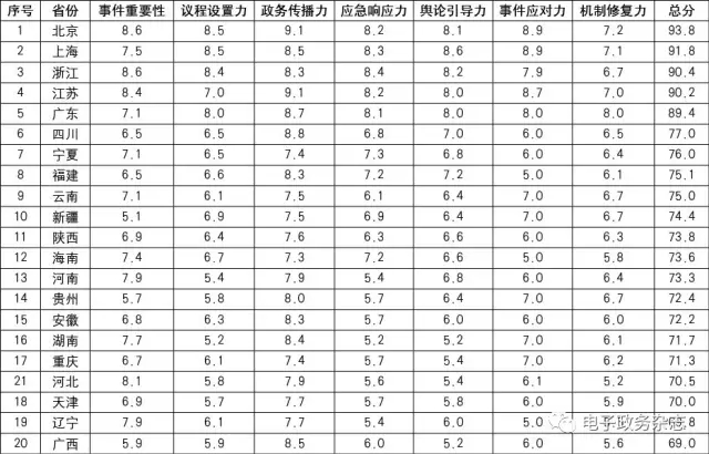 表4 各省市区政务舆情回应指数排行榜TOP20