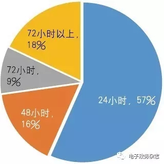 自2016年以来,我国公共部门面对突发性舆情的响应速度显著提升,对舆情早期传播的预警、干预能力也有较大的提高。在统计的646起政务舆情案例中,政府回应率达到87%,有超过57%以上的事件政府首次响应在事发24小时之内,有73%的事件政府部门在48小时之内(含24小时)做出了首次回应(参见图7)。