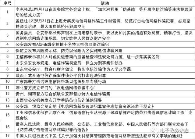 进入9月,包括公安部、工信部、中国人民银行等在内的多个国家部委出台政策重点打击电信诈骗,全国多地掀起打击电信诈骗的专项行动。中央政治局委员、中央政法委书记孟建柱9月初在上海考察反电信网络诈骗工作时强调,电信网络诈骗犯罪已成为社会公害,要坚决遏制电信网络诈骗犯罪高发势头。国务委员、公安部部长郭声琨表示,要以更加扎实的措施有效防范、精准打击、坚决遏制电信网络诈骗犯罪,切实维护人民群众财产安全。