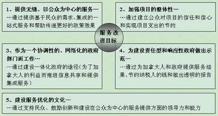 (1)改善服务。包括扩大服务网络在地区和社区中的延伸;设计服务策略以迎合加拿大人的需求;加强服务网络自身的能力建设;构建合作伙伴战略;提高新服务开发能力;将所有的呼叫中心集成。