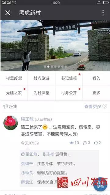 “这还不是最新鲜的。”张树千掏出手机,向记者演示黑虎村微信公众号。“我们这个公众号已有1200余人关注。”张树千边演示边介绍,这个公众号,应用政府网站模块,整合网络资源,开设了“美丽黑虎”和“为村平台”两大功能板块。“美丽黑虎”是政府微门户集群化建设的功能载体,与邛崃市人民政府门户网站手机版一键连通,群众可以通过手机享受到政府门户网站上所有服务。