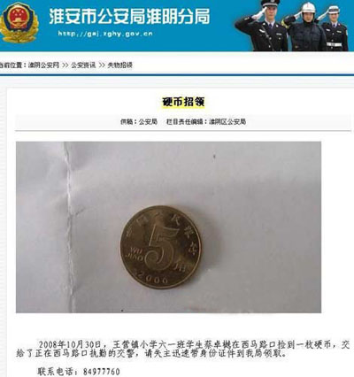 这则5毛钱招领告示系江苏省淮安市淮阴公安分局所发。启示称,“王营镇小学六一班学生蔡卓樾在西马路口捡到一枚硬币,交给了正在西马路口执勤的交警,请失主迅速带身份证件到我局领取”。启示上还附有照片,一枚锈迹斑斑的5毛钱硬币,静静躺在照片里。据悉,这是他们根据上级的要求,作为政府信息公开的具体实施步骤,通过互联网发布失物招领信息。记者搜索到5毛钱硬币页面已被删除。不过,能通过“快照”看到。