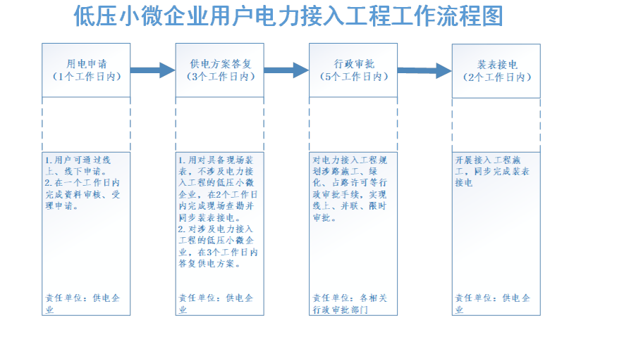 1.进一步压减办电环节。对大中型企业用户(指10千伏及以上高压用户),办电环节压减为“申请受理、供电方案答复、竣工验收、装表接电”4个;对不涉及外部工程的增容项目,进一步压减为“申请受理、供电方案答复、装表接电”3个;对于低压接入的小微企业客户,办电环节压减为“申请受理、供电方案答复、装表接电”3个;对于具备直接装表条件的低压小微企业和居民用户,进一步压减为“申请受理、装表接电”2个。(国网赣州供电公司负责)