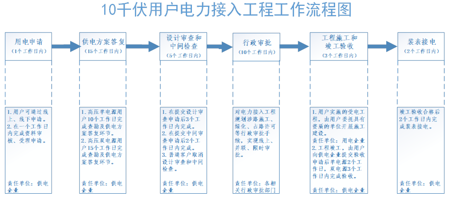 对于10千伏高压单电源用户,供电企业10个工作日内完成供电方案答复。在受电工程建设完成具备接电条件下,用户平均接电时间不超过4个工作日。(注:基于“对用户设计、施工、供货环节三不指定”的红线要求,接电时限不包含用户自主委托设计、施工和设备材料采购环节)。对于10千伏高压双电源用户,供电企业15个工作日内完成供电方案答复。在受电工程建设完成具备接电条件下,用户平均接电时间不超过5个工作日。(国网赣州供电公司、市行政审批局按职责分工负责)