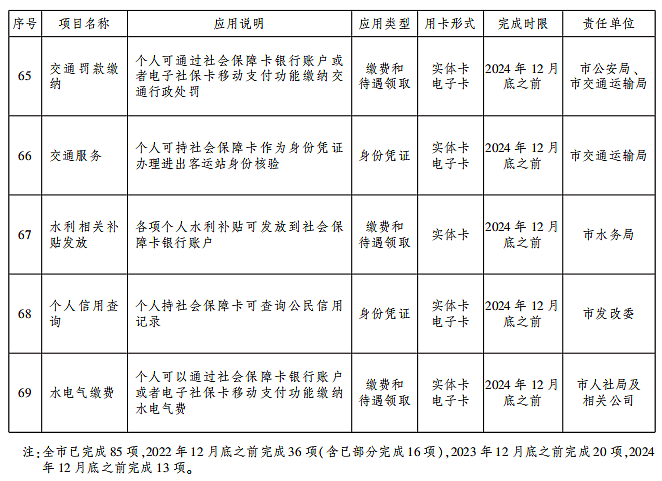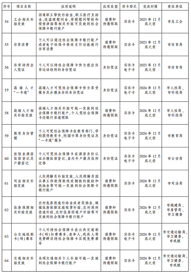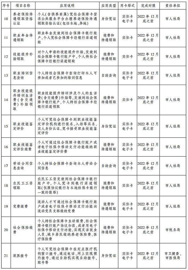2.实现人力资源社会保障领域全业务用卡。增加人力资源社会保障领域线上线下应用场景,将社会保障卡应用贯穿于就业创业、社会保险、人事人才、劳动关系等业务办理和公共服务全过程,全面开通社会保障卡95项应用目录,在全市人力资源社会保障系统实现全业务、全流程、全地域、全人群用卡。