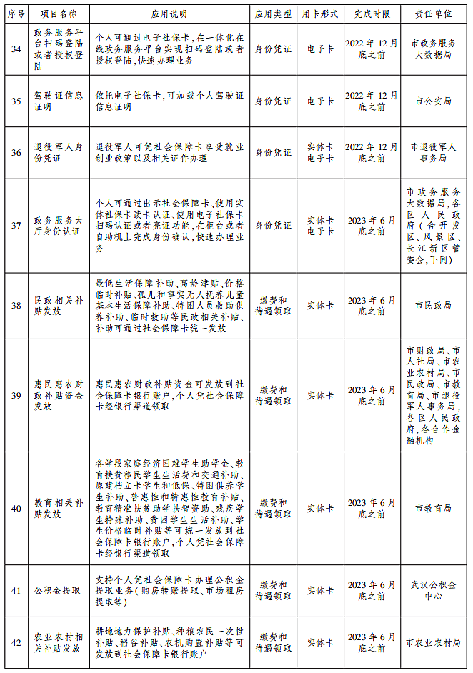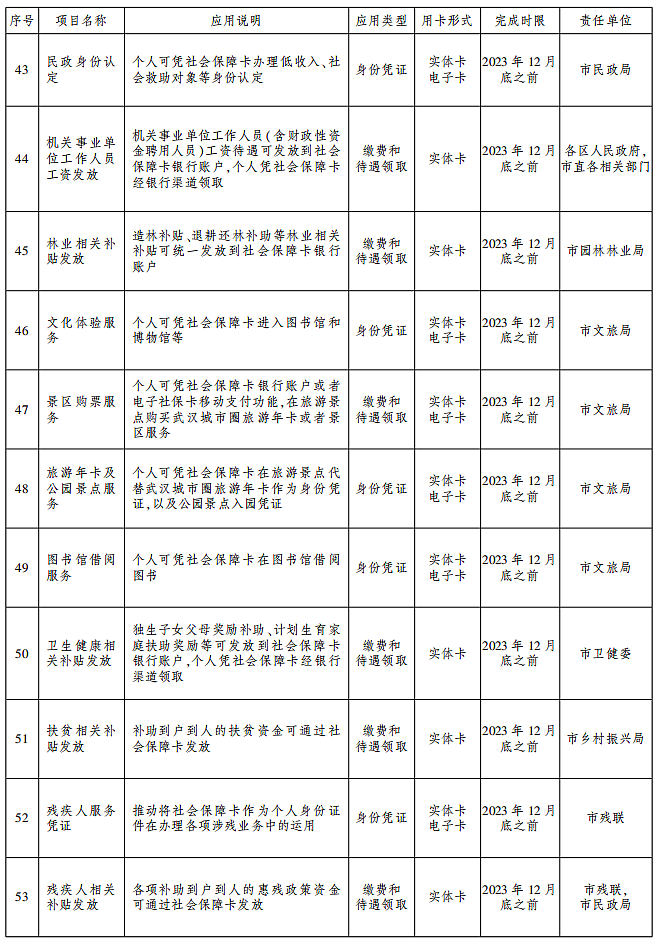 2.加快城市交通出行用卡。巩固提升社会保障卡加载“武汉通”功能优势,深化社会保障卡在地铁、公交、轮渡等城市公共交通领域的应用,推动武汉城市圈其他城市实现持卡群众交通出行“一卡通”。