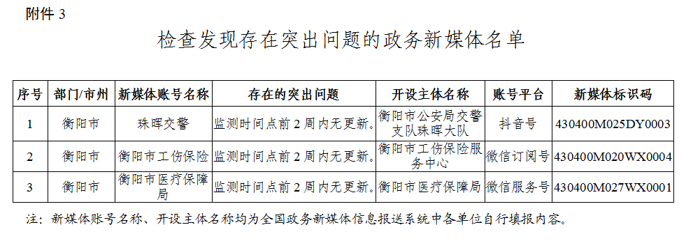 (三)政务新媒体运维管理不够规范。“珠晖交警”“衡阳市工伤保险”“衡阳市医疗保障局”等3家政务新媒体在监测时间点2周内无内容更新。“掌上渌口”“株洲新区”“新资阳”移动客户端未在“全国政务新媒体信息报送系统”中填报。