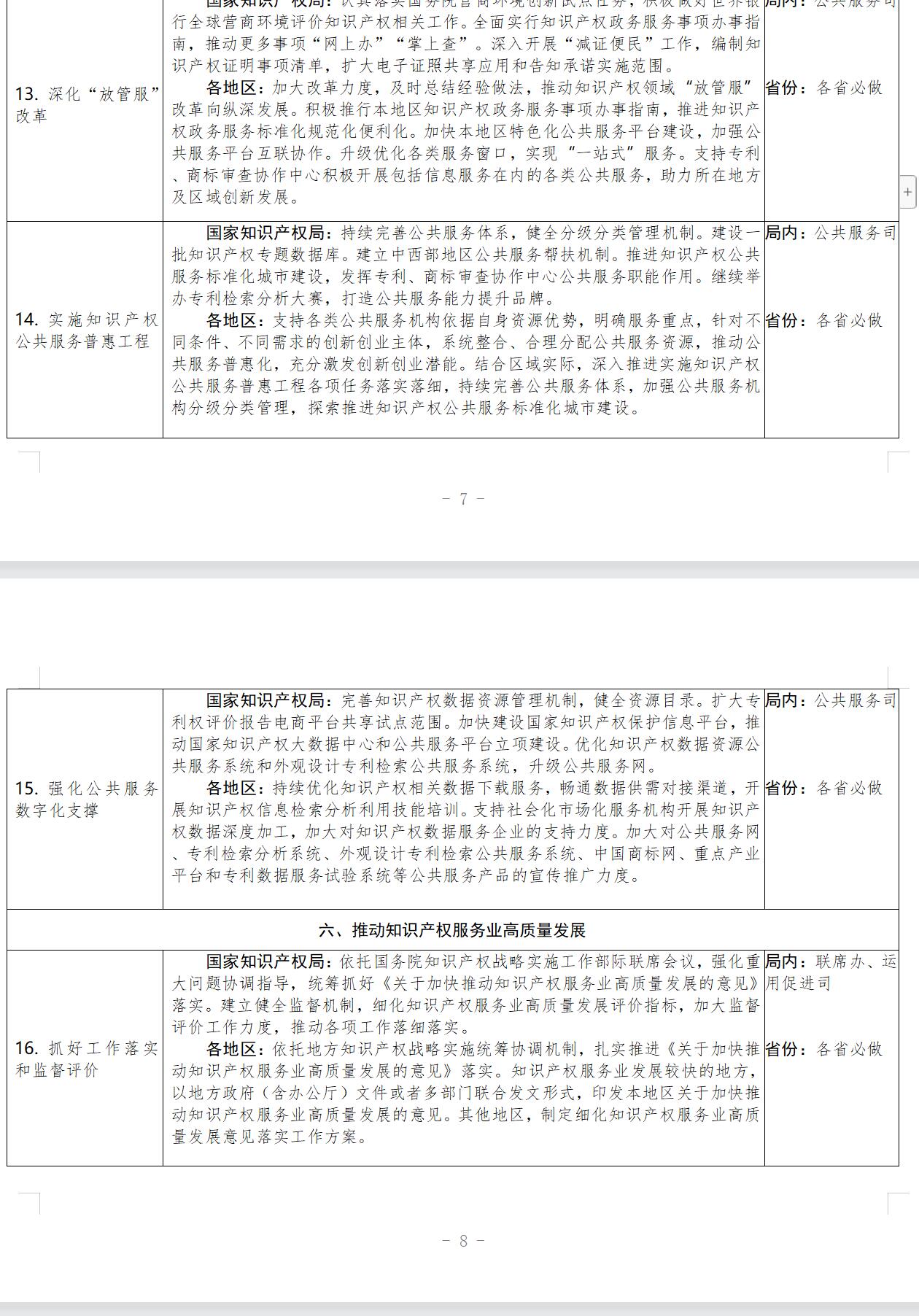 ——知识产权服务。知识产权领域“放管服”改革进一步深化,知识产权公共服务体系不断完善,普惠化、多层次、多元化、专业化的公共服务供给更加丰富。国家知识产权保护信息平台建设有序推进,知识产权数据资源管理机制持续完善,公共服务数字化支撑作用显著提升。规范有序的知识产权服务业发展环境日趋完善,高质量、多元化、国际化服务供给持续扩大,新业态新模式不断涌现。