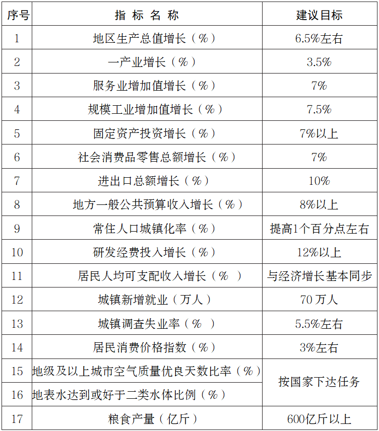 按照省委经济工作会议总体部署,2023年经济社会发展主要预期目标是:地区生产总值增长6.5%左右,第一产业增加值增长3.5%,规模工业增加值增长7.5%,固定资产投资增长7%以上,社会消费品零售总额增长7%,进出口增长10%,地方一般公共预算收入增长8%以上,居民消费价格涨幅3%左右,城镇新增就业70万人,城镇调查失业率5.5%左右,居民收入增长与经济增长基本同步,粮食产量600亿斤以上,生态环境指标稳步改善。