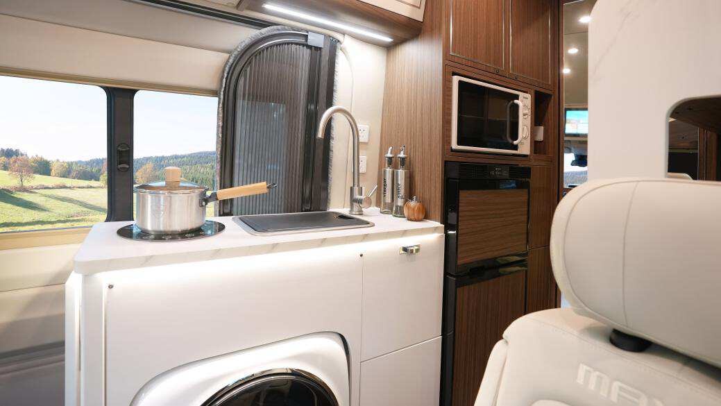 布局方面,旅行家V100采用了更为灵活的设计,有横床/纵床两种布局可供选择,亲子出行或是多人出行也是不在话下。生活设施方面,其搭载了洗衣机、微波炉、外置卡式炉/柴油炉等等生活设备,再加上支持手机APP远程控制的伟巴斯特驻车燃油加热器、10kW大功率行车空调、48V直流变频制冷空调,无论哪个季节出行,都可以确保旅途惬意舒适。