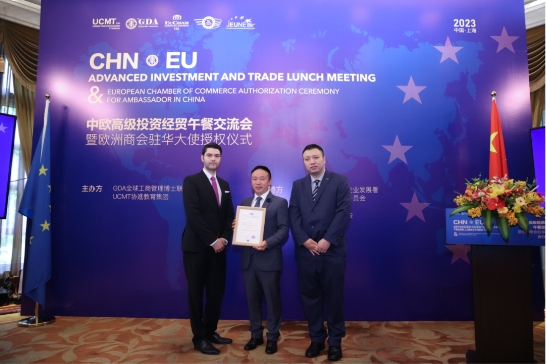2023年5月14日,由GDA全球博士联合会和UCMT主办,世界经合组织中小企业发展署、欧盟旅游投资发展委员会、欧洲商会、欧盟青年商务委员会提供支持的中欧高级投 资经贸午餐交流会暨欧洲商会驻华大使授权仪式,在上海兴国宾馆获得圆满成功。