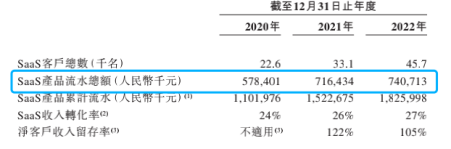 对比客户增长情况,销售额的增长困境更加凸显。2022年比2021年客户数增长了1.26万名,同比增长38.1%,但同期SaaS产品流水总额仅增加了2427.9万,增长3.3%。