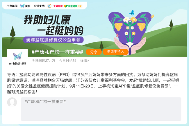 今年9月,澜渟联合天猫健康、阿里健康公益、江苏省妇儿基金会四方联合发起的线上公益活动“我助妇儿康,一起挺妈妈”,免费申领澜渟盆底肌修复仪,总计50 台盆底康复治疗仪,两天时间里,微博话题阅读量超1.5亿,推动公众对女性盆底健康问题的关注与支持。