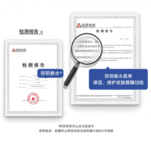 同时,为保证产品的有效性与科学性,弥玥泉联合上海微谱实验检测机构,通过临床试验、仪器检测等方式,对弥玥泉水进行了补水、保湿、舒缓多方面试验,结果表明弥玥泉天山冰川温泉水能够有效的缓解、修护皮肤屏障,从而肯定了弥玥泉产品的温和、安全和有效。