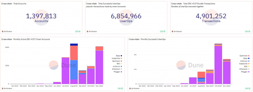 账户抽象的概念最早出现在2022年,随着 EIP-4337: Account Abstraction Using Alt Mempool的更新(一个完全避免共识层协议更改的账户抽象提案,而是依赖于更高层级的基础设施),不少团队开始围绕账户抽象打造产品。 在终端产品上,目前的方向主要包括通过集成账户抽象实现了社交登录,社交恢复,代付gas,批量处理交易等功能的智能合约钱包, 在这面许多团队已经在2023年交付了产品,包括Argent、Avocado、Unipass等,他们在用户体验上都做出了很大的创新。 据Dune数据显示,目前全链已有接近140万个基于EIP-4337创建的账户,产生了接近700万次交易 (UserOps)。 截止本文发布,每月活跃的智能合约账户超过40万。