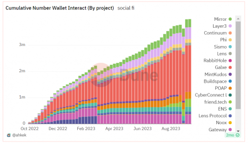 从2021年开始,SocialFi 这一赛道逐步进入加密领域用户的视野, 与链游的社交和娱乐属性相似,被认为是可以带来大量Web3新用户流量的现象级赛道。 相比2021-2022整个赛道较为冷淡的处境,2023年 SocialFi 赛道的一些玩法和设计上的创新获得了不小的流量。 如下图所示,整个 SocialFi 赛道在过去一年迎来了较好的发展,主流项目的累计钱包交互数接近400万次以上,而Galxe、Friend.Tech、Sismo等新项目也收获了不少流量。