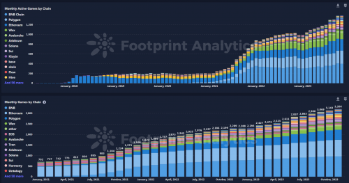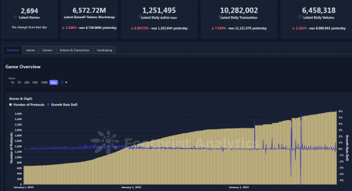 从下图数据来看,2023年游戏项目仍保持持续增长态势。 目前根据Footprint Analytics的项目数据统计(数据截止至2023年12月1日),当前市场链游合约数超2600个,已发币项目流通市值超65亿美元,单日交易量超6百万美元,日活地址数超1百万个, 整体的市场仍在熊市下保持了一定的活跃度。