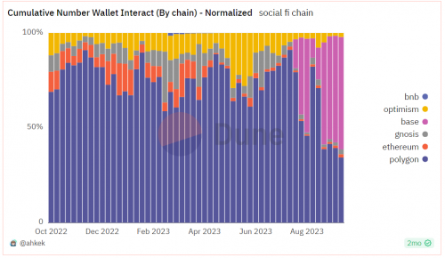 从特定链来看,目前主要的 SocialFi 项目交互集中在Polygon和Base两条链上,其他链目前在社交领域收获流量较少。 除了提供稳定的网络、快速的运算速度和低廉的交互费用外,Polygon在过去的1-2年的时间内积极发展生态内的各项游戏、NFT等应用类项目, 同时拓展受众群,与Web2大IP机构合作,收获了来自加密领域内外的大量流量,在整个 SocialFi 赛道方面呈现出持续稳定的流量增长。 Base得益于Friend.Tech所带来的大量流量,目前占据了 SocialFi 赛道流量的半壁江山。 其他链如Ethereum和BNB等社区相关的流量增长相对比较缓慢。