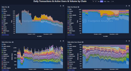 从具体的生态来看,目前整个市场的日活地址数超百万,绝对流量集中在Wax链上。 得益于其低廉的交互成本和快捷的结算体验,Wax历经牛熊仍然保持了其最高的市场占有率地位, 其他的公链如Near、Celo和Polygon等也有一定的市场占有率。