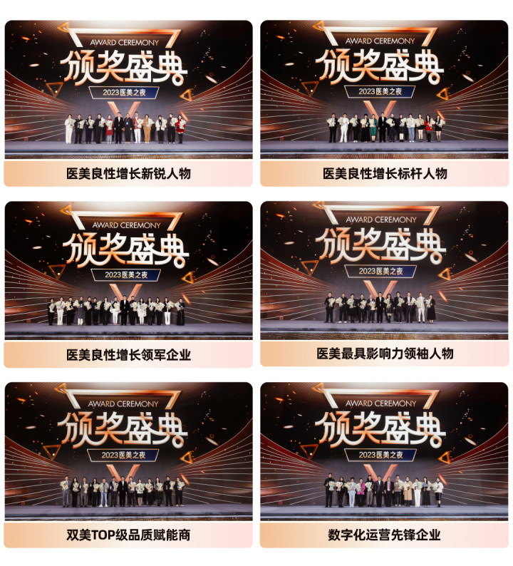 本届医美之夜颁奖盛典共颁发“医美良性增长新锐人物”、“医美良性增长标杆人物”、“医美良性增长领军企业”、“医美最具影响力领 袖人物”、“双美TOP级品质赋能商”和“数字化运营先锋企业”六大奖项,汇集了行业极具影响力人物与机构,对2023年过去一年间,在医美行业发展中做出突出贡献的机构和个人进行表彰。此次盛典更是一次全行业的沟通交流盛会,努力推动国内医美行业发展新趋势。