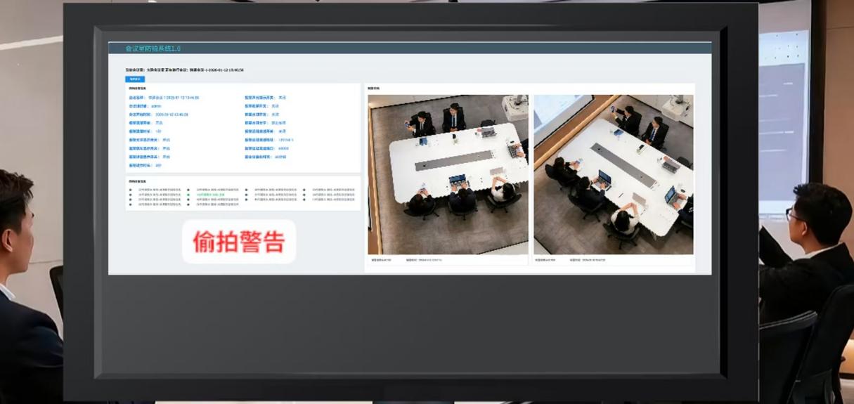 摒弃传统人工排查的滞后性,系统实现 2 秒极速处理响应,检测到违规拍摄行为的瞬间,无需人工干预,自动触发智能告警机制。告警信息以全屏高亮弹窗、醒目警示文字形式直接展示在会议屏幕,“请注意,有人拍照” 等提示清晰直观,在场人员可第一时间察觉窃照行为,为现场制止泄密争取黄金时间,同时对意图偷拍者形成强力心理震慑,有效遏制会议室防拍照、空间防拍照场景下的窃照行为实施,强化涉密空间防拍的现场警示效果。
